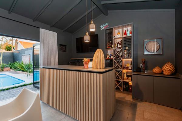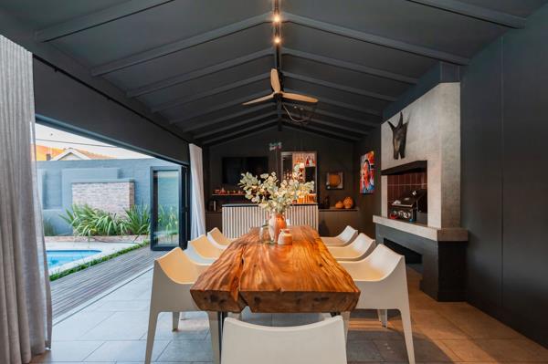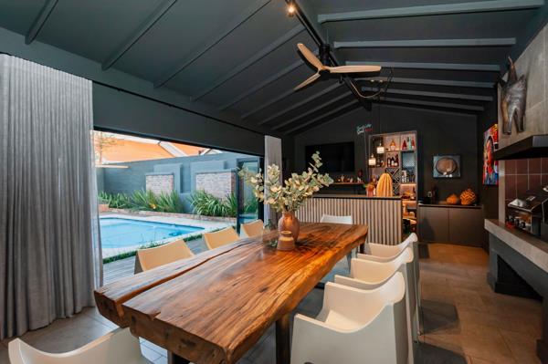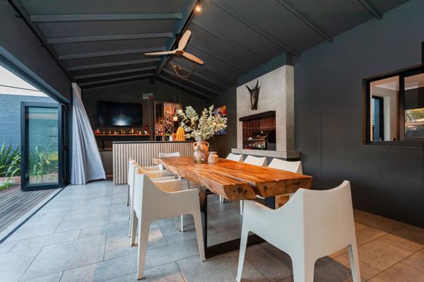 The kitchen flows into the enclosed entertainment patio, featuring a custom designed bar, gas braai and open truss ceilings. Leading from the patio through the folding stacking doors to the back garden features the swimming pool, timber decking, a fireplace with a pergola and hanging fairy lights Ideal for relaxed indoor outdoor living.