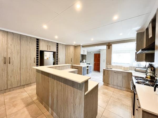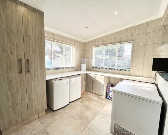 The kitchen is fitted with granite countertops, has ample cupboard space, a Smeg gas stove, a pep bowl sink and more than adequate space for appliances. The quaint coffee station is positioned to the back and at the far back is the scullery and a laundry.
