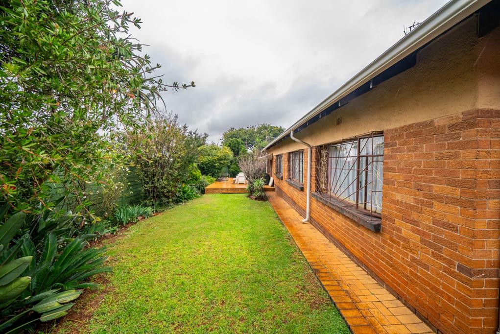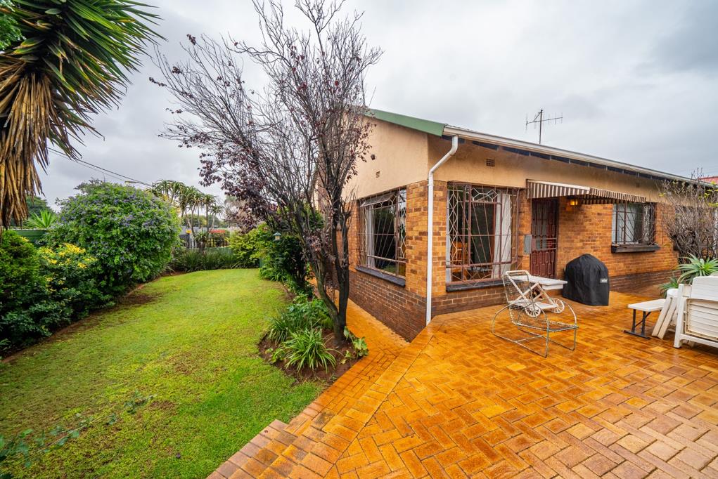 Outside, the generous 730 sqm erf features a lush, well-maintained garden and paved areas, perfect for outdoor relaxation and entertaining. The property offers a private outdoor space with mature trees, enhancing its serene atmosphere. Security is enhanced with electric fencing and a totally walled perimeter, providing peace of mind. Security bars on windows offer an additional layer of protection.