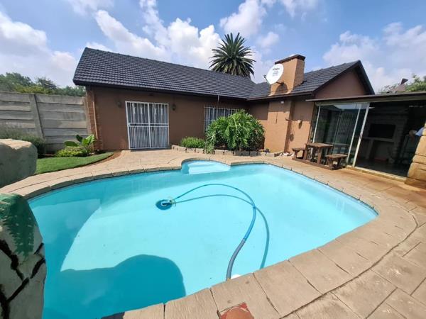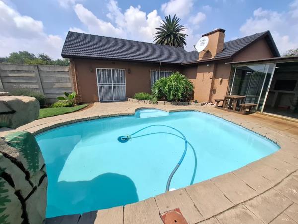 Ample parking includes a double garage, covered carport, and paved driveway. The property boasts a private garden, sparkling swimming pool, and built-in braaiperfect for entertaining and outdoor living.