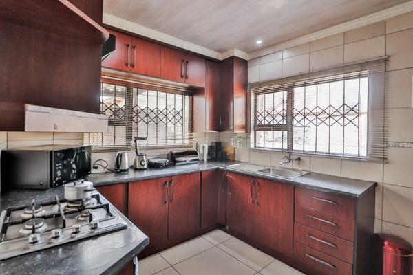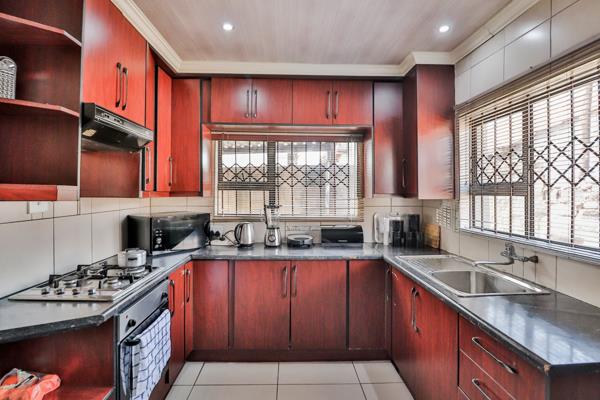 The kitchen is equipped with extensive dark wood-look cabinetry, providing ample storage, complemented by dark countertops. It features a built-in gas stovetop, oven, and a functional double sink. Two windows, fitted with security bars, allow for natural light and ventilation. The kitchen also accommodates an integrated washing machine and a modern fridgefreezer, making it a highly practical space.