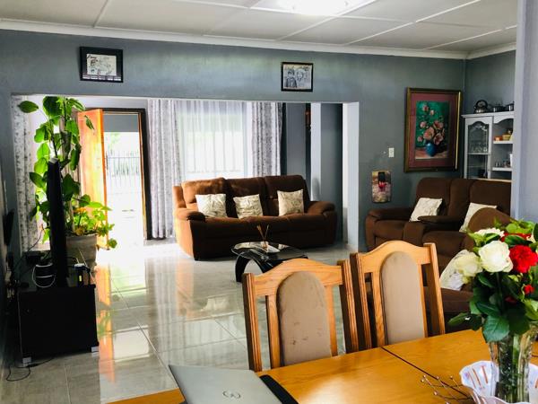 Hosts an open-plan layout designed for comfortable living. The spacious lounge and dining areas are adorned with light tiled flooring and neutral grey walls, the residence features three well-proportioned bedrooms, ensuring private retreats for all family members. There are two bathrooms, including a private ensuite, alongside a separate guest toilet for added practicality. For peace of mind, the property is totally walled and secured with security gates and burglar bars.