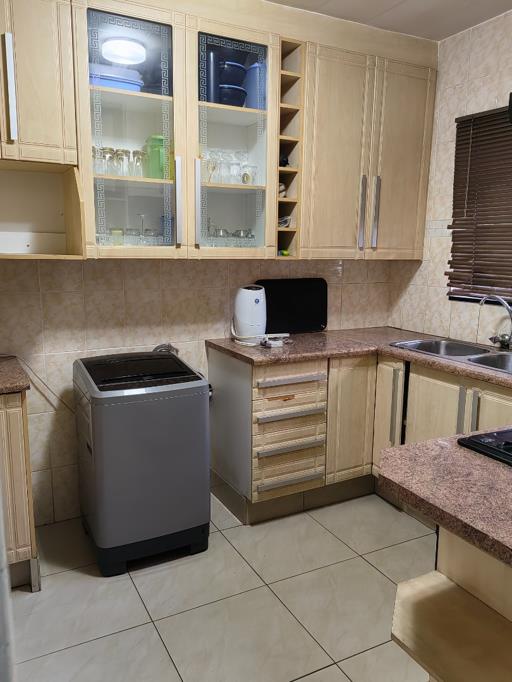 The functional kitchen boasts a practical U-shaped layout, maximising space and efficiency. It is equipped with ample light-coloured cabinetry, granite-look laminate countertops, a built-in hob, oven, and an extractor fan. A double sink and tiled backsplash ensure easy maintenance, while the inclusion of a washing machine adds convenience to daily chores, making this a highly practical space.