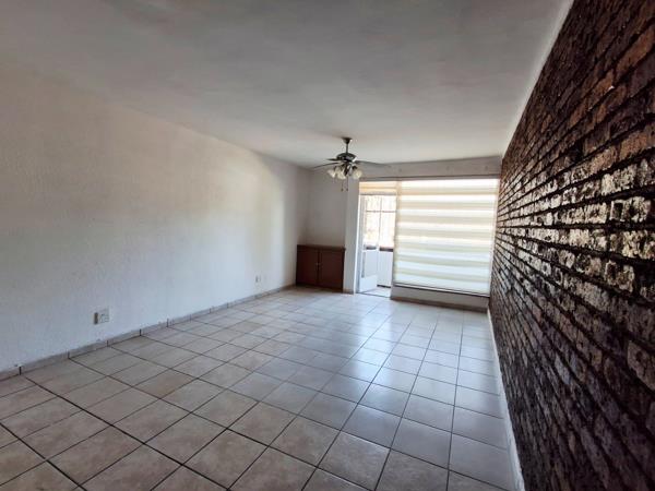 Discover this inviting 75 sqm residential unit, ideally situated in the suburban heart of Germiston South, Germiston. This property offers a practical and comfortable living space, perfect for individuals or small families seeking convenience in South Africa. The interior boasts a well-lit lounge area, featuring durable tiled flooring and a distinctive exposed brick accent wall that adds character. Natural light floods the space through large windows, complemented by a functional ceiling fan for comfort.