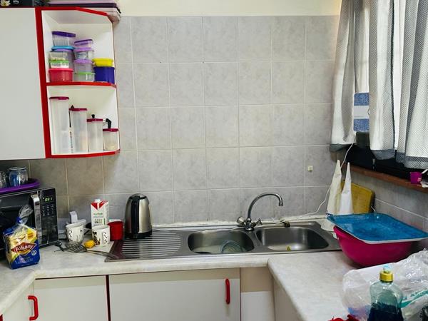 This functional apartment in Germiston South offers a practical living solution. The combined living and dining area is designed for efficiency, featuring tiled flooring and neutral white walls that provide a versatile canvas for personal touches. A large window ensures ample natural light fills the space, creating a bright and inviting atmosphere. The kitchen is equipped with a double stainless steel sink, a tiled backsplash for easy maintenance, and open shelving, offering a practical space for daily meal preparation.