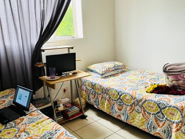 The residence comprises two comfortable bedrooms, each benefiting from tiled flooring and natural light through well-placed windows. One bedroom includes built-in storage, enhancing functionality and organisation. These rooms offer flexible accommodation options, with some capable of housing two single beds. The single bathroom features a bathtub and sink, complemented by tiled walls and natural light, providing essential amenities for residents.