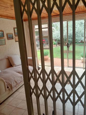 Tranquil home in a charming suburban neighborhood, conveniently close to shops yet in a peaceful setting. It boasts a beautiful garden and lapa for entertaining, creating a serene atmosphere. The house features 3 bedrooms, a study, 2 lounges, and a dining room, with robust security measures including security doors separating areas. One lounge, with a wooden ceiling, offers a secure view of the garden. The main bedroom includes an en-suite bathroom and a walk-in dressing room with garden access. Security is paramount, with an alarm system, solar-powered garden lights for nighttime safety, and an electric gate. Additional amenities include an outside laundry, extra bathrooms, storage rooms, and a garage. The kitchen is a chef''s delight, featuring modern appliances integrated seamlessly with classic cabinetry, providing ample storage and workspace.The adjacent dining room, filled with natural light from large windows, ensures that family dinners are a warm and inviting experience.