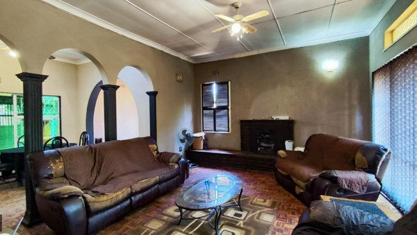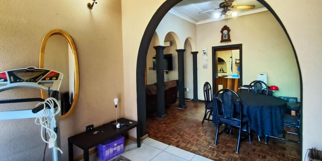 Step inside to an inviting open-plan layout, characterized by distinctive arched entryways and decorative pillars. The spacious lounge, complete with a cozy fireplace and a ceiling fan, provides a comfortable setting for relaxation. Adjacent to this, the dining area flows seamlessly, featuring parquet flooring that offers a classic foundation ready for restoration.