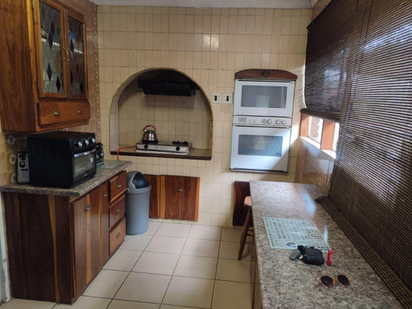 The functional kitchen is equipped with wooden cabinetry, granite-look countertops, and tiled flooring, providing ample space for culinary pursuits. It accommodates essential appliances, including a built-in oven, microwave, and a gas stovetop, alongside dedicated areas for multiple refrigerators and a chest freezer. This practical space offers extensive storage and preparation surfaces.