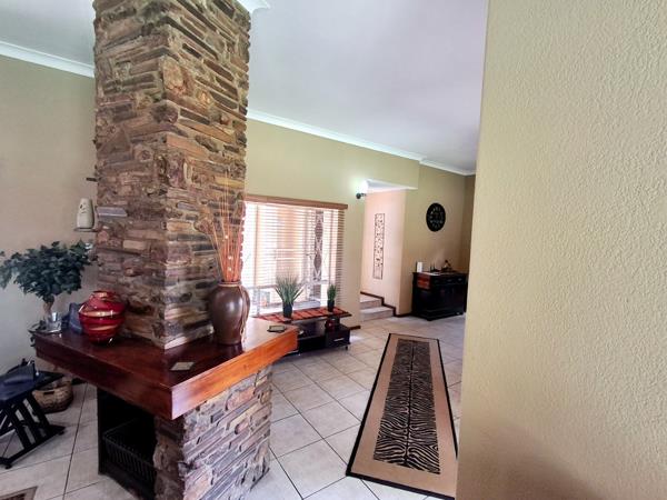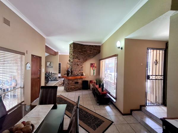 Step inside to find spacious living areas featuring high ceilings, durable tiled flooring, and ample natural light from large windows. The open-plan design seamlessly connects the lounge and dining areas, creating an ideal space for family gatherings and entertaining. Unique rustic stone accent walls and a prominent fireplace add character and warmth to the main living spaces, complemented by modern recessed lighting.