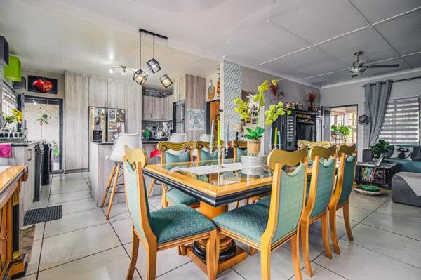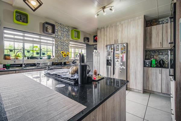 The heart of the home is an open plan kitchen, lounge equipped with a gas fireplace, and dining area that invites warmth and togetherness. The standout kitchen is equipped with stunning granite countertops, ample cupboard space, and modern appliances, including a double eye-level oven. The center island with a gas hob and breakfast nook is perfect for casual dining and entertaining friends and family. Enjoy gatherings in the covered patio located outside the kitchen, an excellent space for entertaining and al fresco dining, surrounded by your lush garden.
