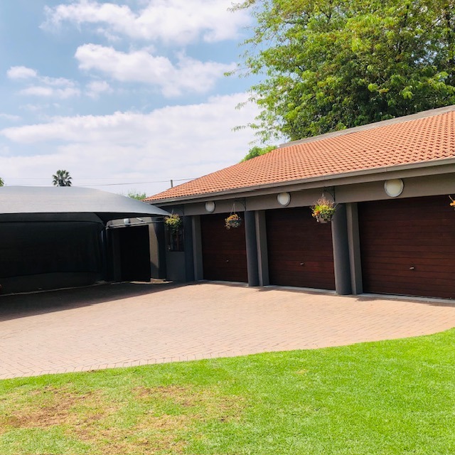 This sprawling single-story residence, set on a generous 1500 sqm erf, immediately impresses with its Mediterranean-inspired architecture, terracotta tiled roofs, and meticulously maintained, lush landscaping. A substantial, neatly paved brick driveway and forecourt provide ample parking, leading to inviting covered verandas and an attractive entrance.