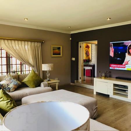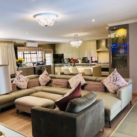 Inside, the home offers a thoughtfully designed layout featuring a well-appointed kitchen with a pantry, a dedicated dining room, and two spacious lounges. Modern laminate flooring and recessed lighting contribute to a contemporary ambiance, while a custom-built wet bar in one living area adds sophistication, perfect for entertaining.
