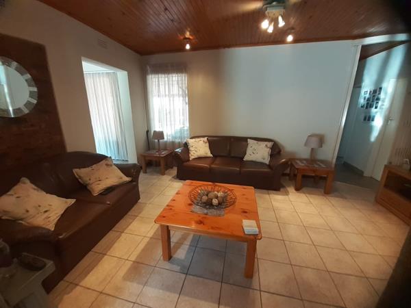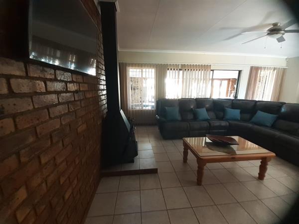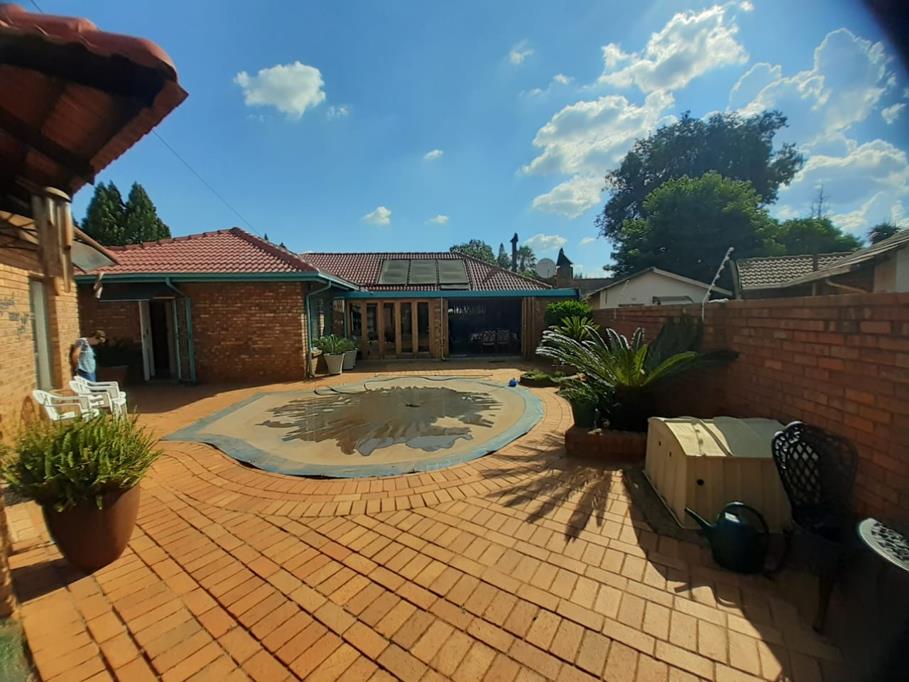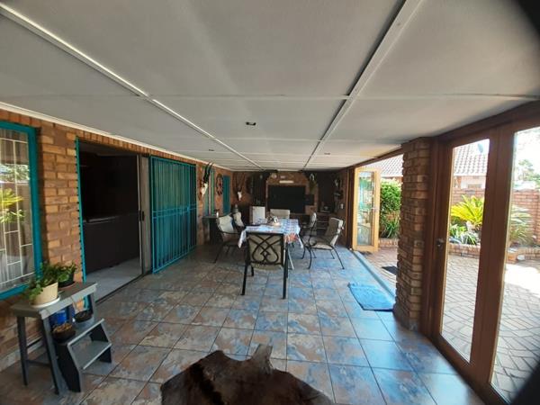 The outdoor spaces are equally impressive, featuring a private swimming pool surrounded by extensive, well-maintained brick paving, creating a large patio perfect for relaxation or entertaining. An enclosed braai room with a built-in braai offers an all-weather entertainment solution, opening directly to the garden. The property provides ample parking with two garages and four additional parking spaces, ensuring convenience for residents and guests.