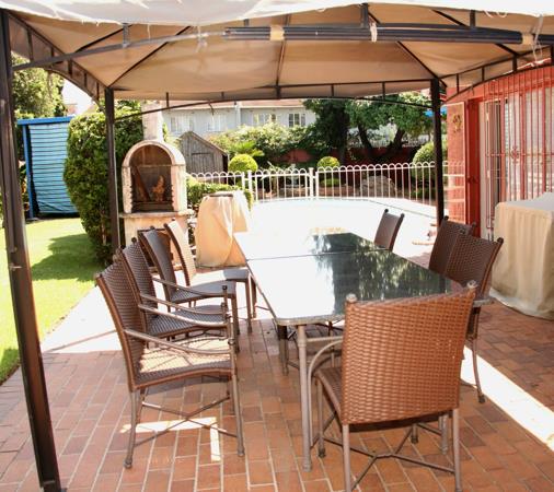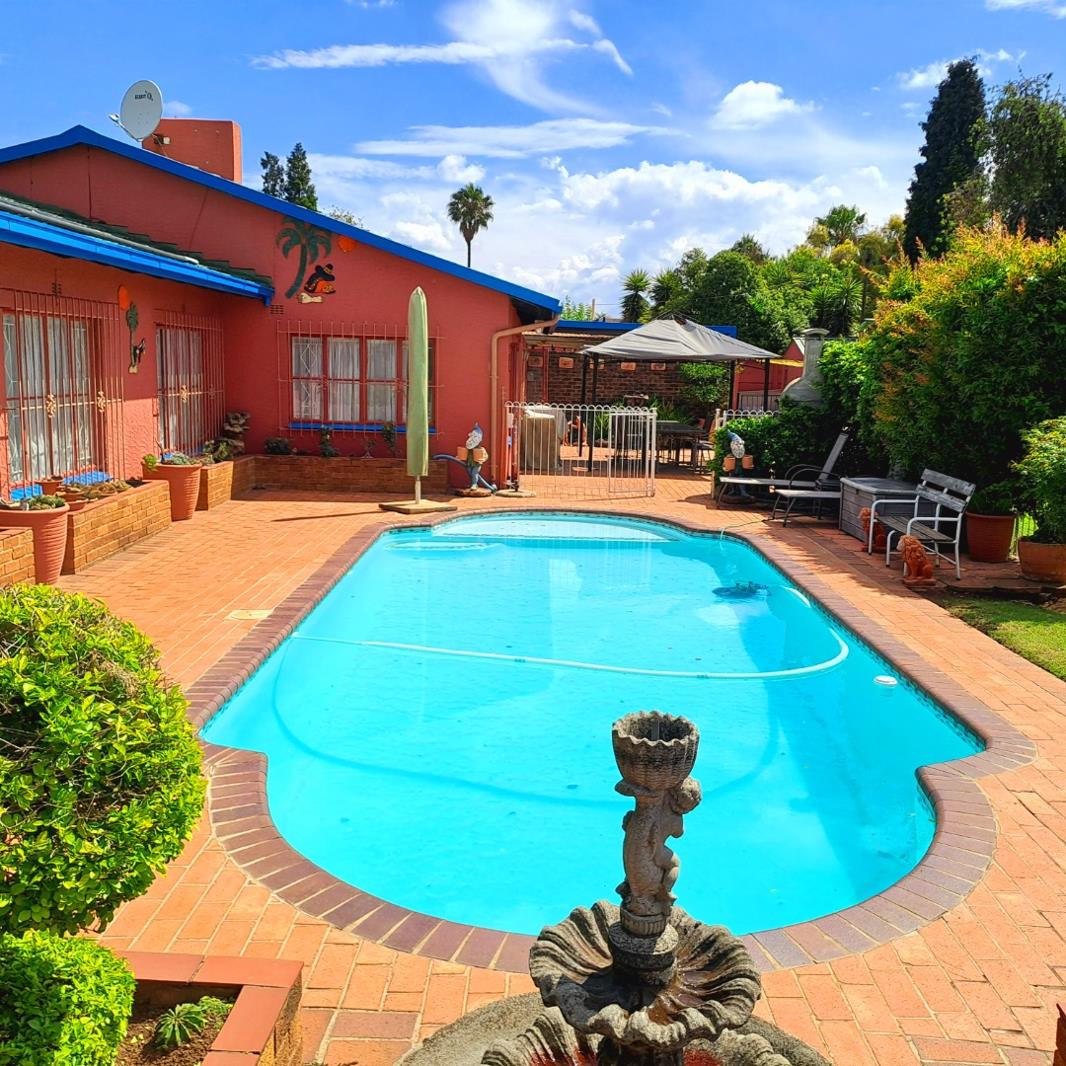 This home comprises four comfortable bedrooms and two bathrooms, offering private retreats for the entire family. For added convenience, staff quarters are also available on the property. Step outside to a private oasis featuring a well-maintained swimming pool, perfect for cooling off during warm South African days. The extensive brick-paved patio, complete with a shaded gazebo, creates an ideal setting for outdoor dining and entertaining, overlooking a lush, mature garden that provides privacy and a serene atmosphere. The property benefits from ample parking, including two garages and space for eight additional vehicles, alongside a paved driveway.