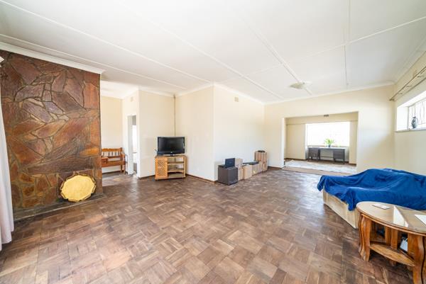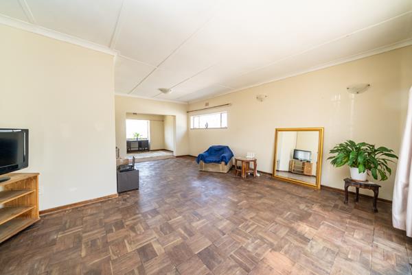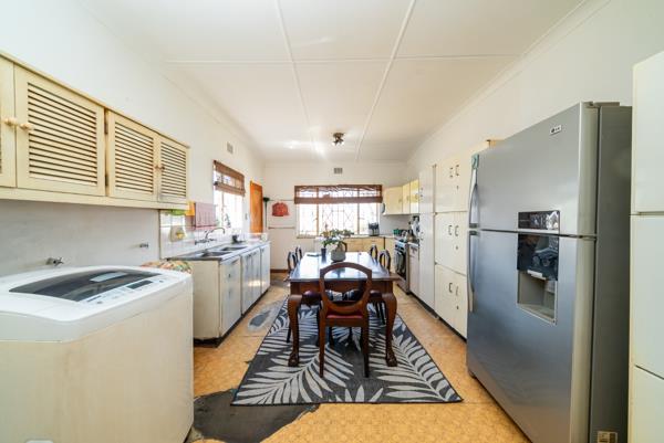 Inside, the home offers a functional layout with a lounge, a dining room, and a kitchen. The living areas are bright and spacious, benefiting from abundant natural light, and feature classic parquet flooring that holds potential for restoration. A distinctive stone feature wall adds character to the main living space. The kitchen, while functional with ample storage and space for a dining table, awaits a modern transformation to unlock its full potential.