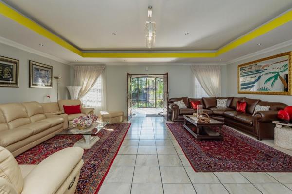 Spanning 400 sqm, the interior boasts generous living spaces, including two distinct lounges and a dedicated dining room, all featuring durable tiled flooring and high ceilings with decorative lighting. The home benefits from two well-appointed kitchens, each equipped with extensive cabinetry, quality countertops, and modern appliances like built-in ovens, gas hobs, and dishwashers. A pantry provides additional storage.