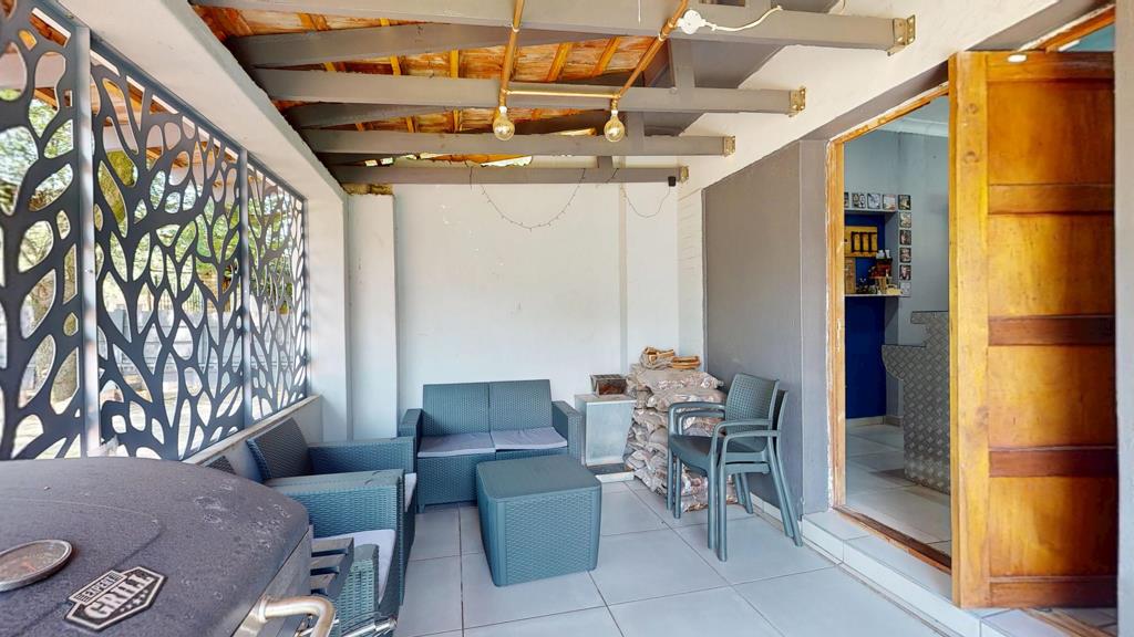 Outdoors, the property truly shines. The expansive back garden is perfect for children, pets, and outdoor enjoyment. The centrepiece is the sparkling solar-heated swimming pool, allowing year-round relaxation. A borehole ensures a reliable water supply for the garden and outdoor areas a major advantage for saving on utility costs.