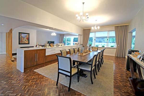 Inside, the home unfolds into expansive open-plan living where the kitchen, dining, and TV lounge come together in a seamless space designed for both everyday comfort and high-end entertaining. A sophisticated entertainment lounge links directly to the impressive ten-car garage, while the dining area flows into a sleek bar and wine cellar. Stacker doors open fully onto a covered patio with built-in braai and extraction system, creating effortless indoor-outdoor living.