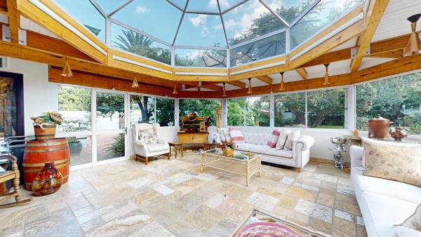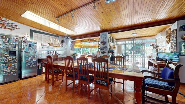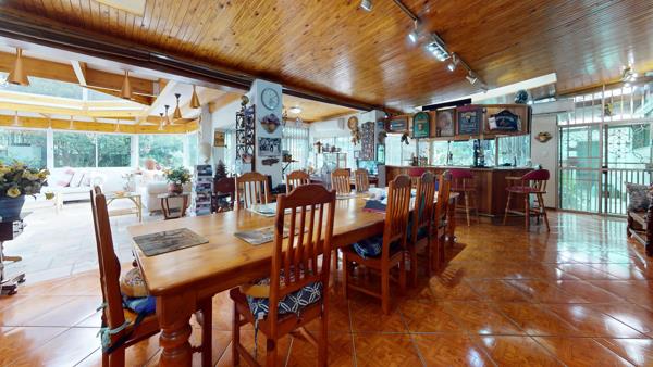 From the moment you arrive, the property impresses with its immaculate, established gardens, creating a serene and private setting. These gardens are beautifully enjoyed from the expansive indoor entertainment area, flooded with natural light through glass skylights and sliding aluminium windows. Featuring a knotty pine ceiling throughout, this space is designed for memorable gatherings and includes a full English-style pub and a 10-seater dining table, making it an entertainers dream.