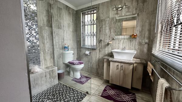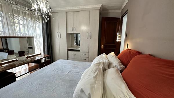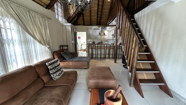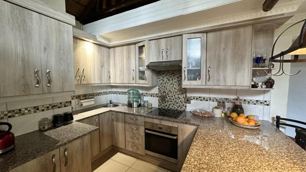 The quant 3-bedroom family home is situated in a lovely complex with only 7 units in the leavy suburb of Lambton in Germiston. All homes are thatched roofed and have a serene and peaceful atmosphere. Once inside the high walls one relaxes and take a casual walk through the small complex of thatched homes with private gardens and a communal pool. The beautiful designer kitchen is complemented with a scullery with similar wrapped doors and granite tops. It has a state of the art glass hob and undercounter oven, breakfast nook and prep bowl and complementary backsplash giving a stunning, modern effect. It is open plan to the lounge area with a stately chandelier, two wooden sliding doors leading to the evergreen garden with a spectacular water feature and a private, tiled lapa with a built-in braai. All this is perfect for entertaining.