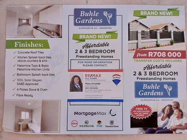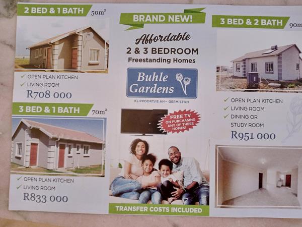 This is a very spacious 70 Square meter home. This home comes with 3 bedrooms of good size, 1 bathroom but with an option of 2 bathrooms depending on your choice. Open plan kitchen with basic kitchen units and a 4 plate stove. The property has a lounge area and a solar geyser. There is a Free Tv with every registered property.