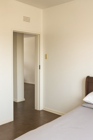 The residence offers two comfortable bedrooms, each featuring neutral tones and classic parquet flooring, providing a versatile canvas for personal styling. Natural light floods both rooms through generous windows, with one bedroom including a dedicated desk area. The property includes 1.5 bathrooms a main bathroom with a modern glass shower enclosure, toilet, and wall-mounted sink, and a separate guest toilet, both featuring clean tiled surfaces.