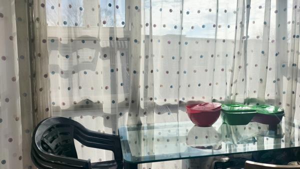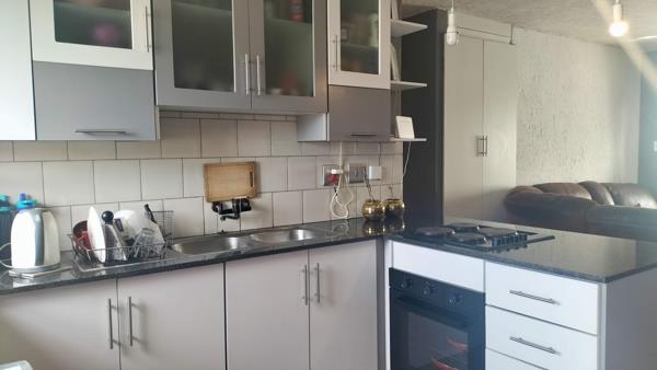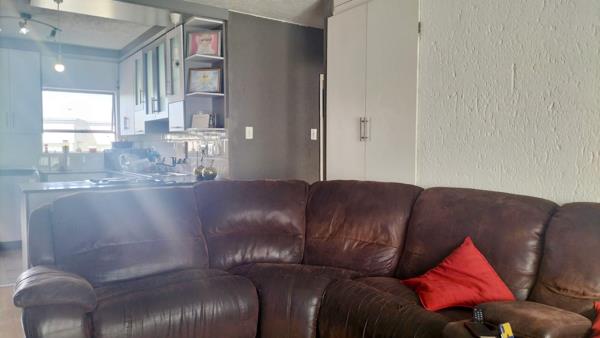 Open-plan kitchen and living area with an enclosed balcony that has big sliding windows