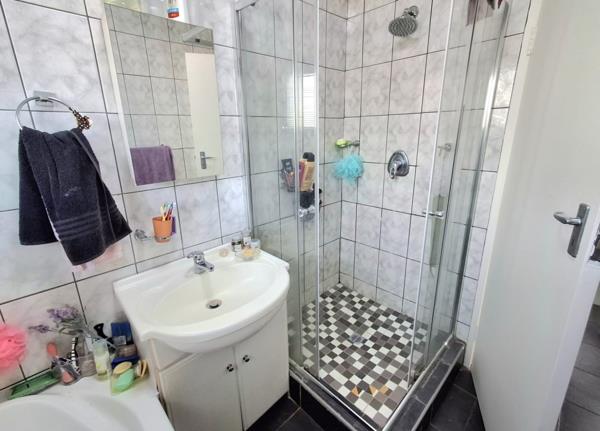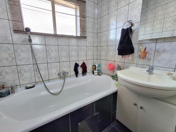 Upstairs, you have 2 spacious bedrooms , the main bedroom is larger and has built in cupboards and a French door that leads out onto a balcony. There is a full modern bathroom , with bath , shower and vanity basin. The toilet is in a separate room , for family convenience and privacy.