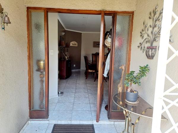Step outside to a private oasis featuring a large swimming pool, perfect for relaxation and recreation. The lush, well-maintained tropical garden, complete with mature trees and palm trees, creates a serene environment. An extensive covered patio, equipped with a built-in braai, offers an ideal setting for outdoor dining and entertaining, accessible via sliding doors. The property also includes two garages and six additional parking spaces, ensuring ample vehicle accommodation.