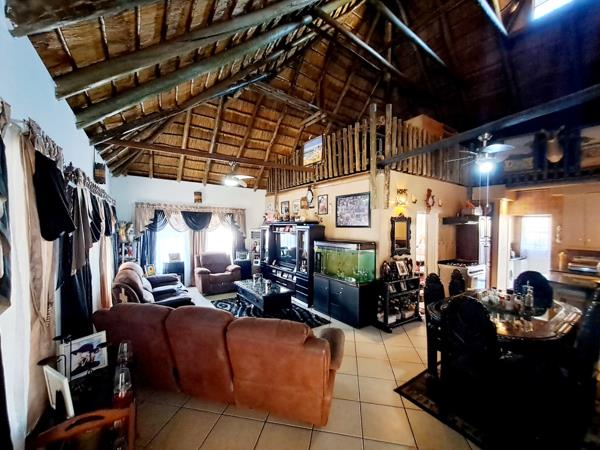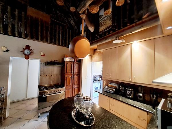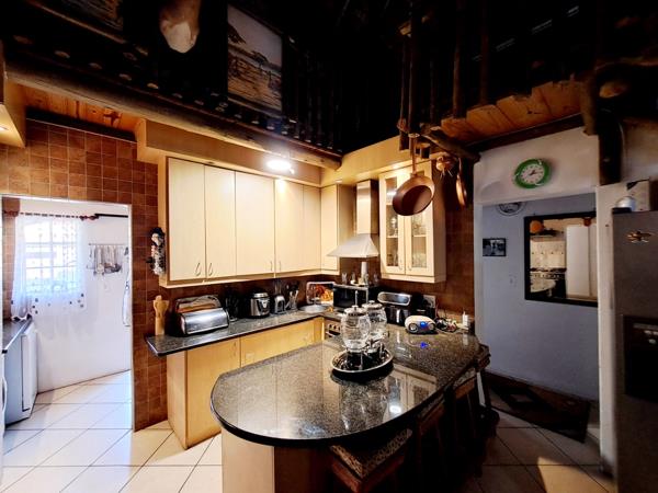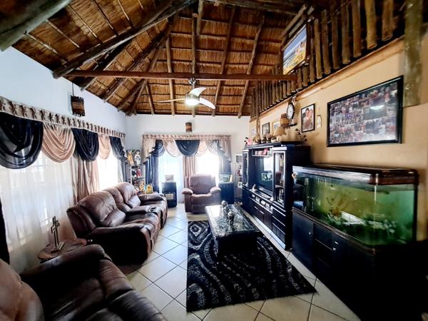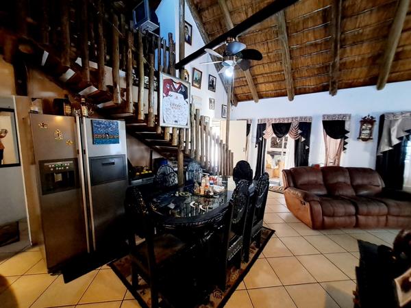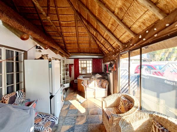 Discover a unique residential sale opportunity in the suburban heart of Parkhill Gardens, Germiston. This charming 3-bedroom, 2-bathroom home, set on a 397 sqm erf, offers a distinctive living experience with its characteristic thatched roof architecture and rustic design elements. The property boasts an inviting open-plan layout, seamlessly connecting the lounge and dining areas, both featuring high ceilings and exposed wooden beams that add warmth and character. Tiled flooring throughout ensures practicality and ease of maintenance.