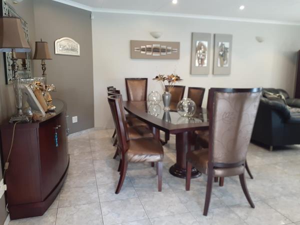 The interior of the home features a well-designed layout, including two lounges, a dedicated dining room, and a functional kitchen with a pantry. Tiled flooring throughout ensures easy maintenance, while recessed lighting illuminates the living spaces. The kitchen boasts ample cabinetry and integrated appliances, opening to the dining area for seamless entertaining. An entrance hall and a guest toilet add to the home''s practical appeal.