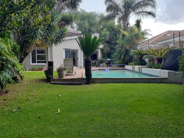 Step outside to a meticulously maintained garden featuring a private swimming pool, ideal for leisure and recreation. The expansive lawn and mature landscaping create a serene outdoor oasis. Practical amenities include three garages, staff quarters, domestic rooms, outside toilets, a laundry room, and additional storage. A built-in braai and paving enhance the outdoor living experience.