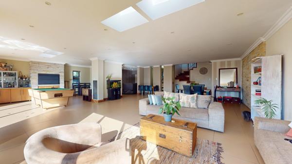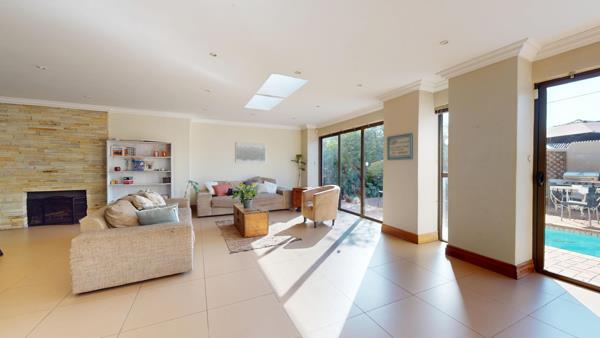 To the right, the expansive open-plan living and dining area flows seamlessly into a well-appointed entertainment space featuring a built-in bar and built-in braai perfect for hosting family and friends. Large sliding doors open out to a beautifully landscaped back garden, complete with a medium-sized swimming pool and lush greenery, offering a tranquil outdoor retreat.