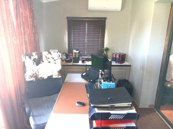 Down the passage are three generously sized, air-conditioned bedrooms, serviced by two full bathrooms. For peace of mind, the home includes burglar bars on all windows, security gates on all doors, and a comprehensive alarm system.