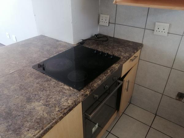 Downstairs is the open plan kitchen and living area. The kitchen has a glass stove top with under counter oven, a single sink and space for a fridge. The double-width counter surface has cupboards on the kitchen side as well as on the living area side .