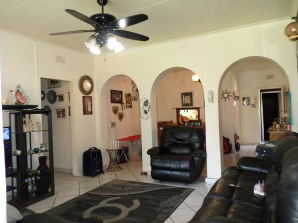The interior features a functional layout with tiled flooring throughout, ensuring easy maintenance. The living room is bathed in natural light from large windows and a glass sliding door, which also provides access to the outdoor areas. Architectural charm is evident with arched doorways, and a ceiling fan ensures comfort. The kitchen, also fully tiled, offers built- in cupboards and leads out to a court yard area.