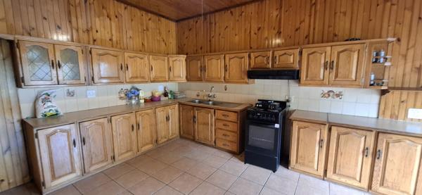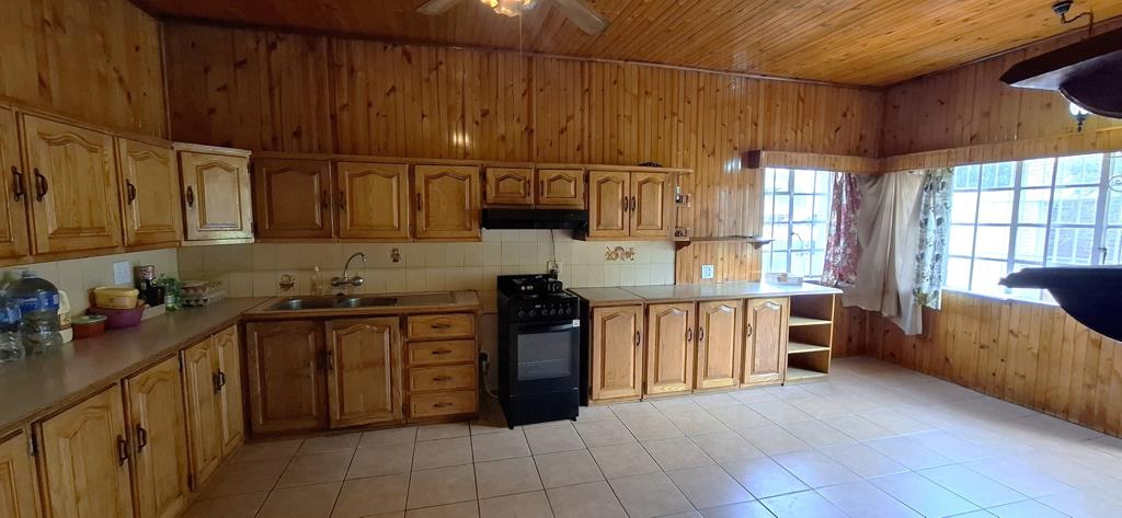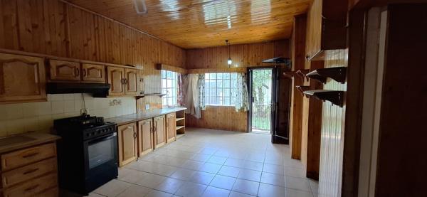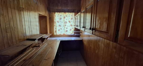 The spacious kitchen is both practical and welcoming, featuring wooden panelling throughout, tiled flooring, ample cupboard and appliance space, and a ceiling fan for added comfort. A well-appointed pantry leads off the kitchen and offers generous shelving, wooden panelling, and a convenient serving window that opens directly into the kitchen.