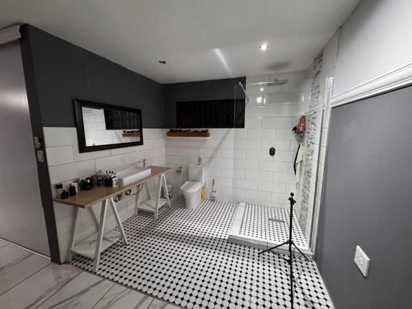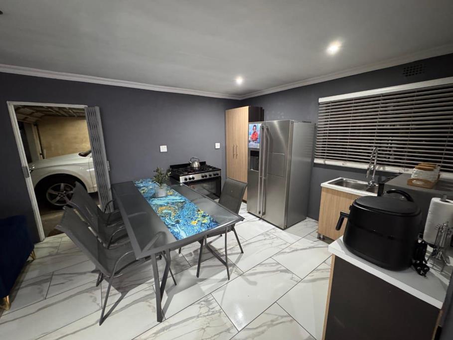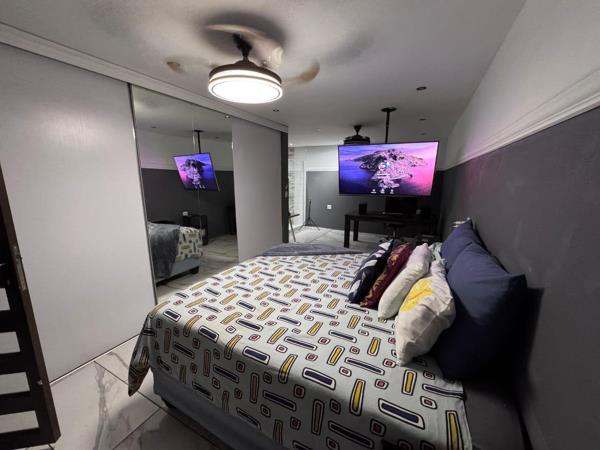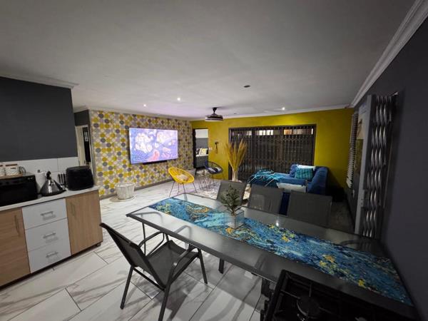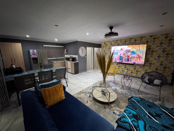 The open-plan design of the living spaces includes a spacious lounge and dining area, which also feature aluminum sliding gates that add a touch of contemporary elegance. Security is a top priority in this home, with comprehensive features such as burglar bars and CCTV systems ensuring peace of mind for you and your family.