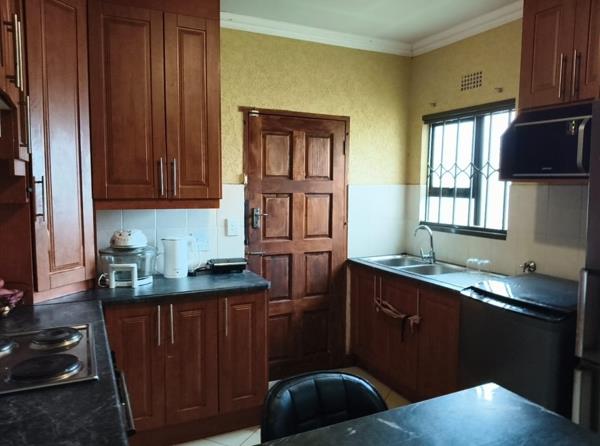 The home boasts an open-plan kitchen fitted with built-in units, flowing seamlessly into the dining and sitting area, which is complemented by a cozy fireplace. The house features a modern design with aluminium windows and burglar bars for added security including an alarm system.