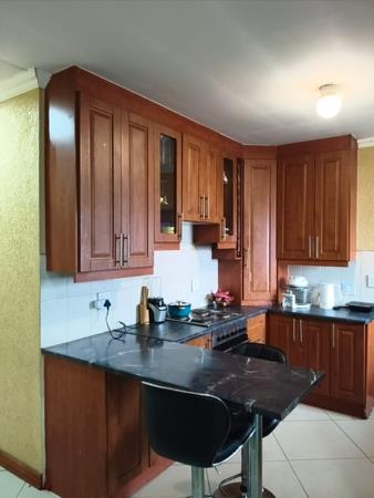 Step inside to an open-plan layout designed for comfortable living. The lounge area features clean tiled flooring, recessed ceiling lights, and crown molding, providing a stylish and welcoming atmosphere. The functional kitchen boasts extensive wooden cabinetry, durable dark countertops with an integrated breakfast bar, and a practical white tiled backsplash, offering ample storage and preparation space for culinary enthusiasts.