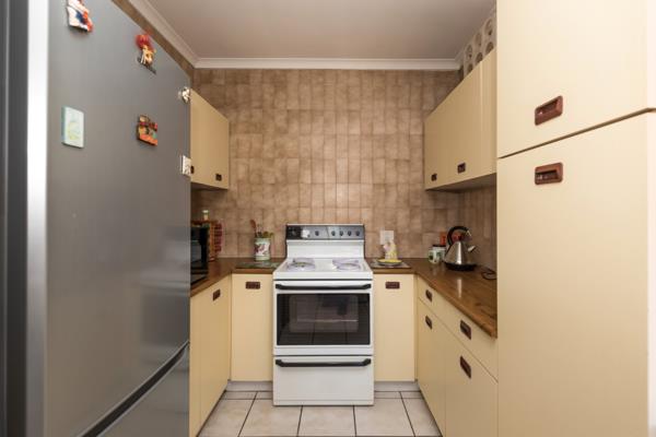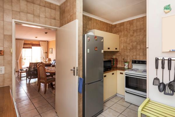 Adjoining is a compact kitchen with a utility area of scullery with double sink and laundry appliances slightly separate. White kitchen cabinets with wooden counter tops provide good storage and the kitchen is tiled floor to ceiling. A large Defy solid plate stove with oven and warming drawer completes the area. Leading directly out from the scullery to the garage, the area also houses a storeroom for your convenience.