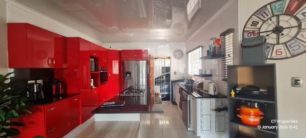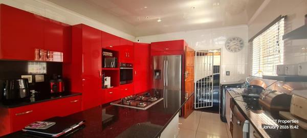 The contemporary kitchen is fitted with elegant granite countertops, a gas stove, and a central island&mdashperfect for cooking and entertaining. The open-plan layout flows seamlessly into a spacious lounge and dining area, creating a bright and inviting living space.
