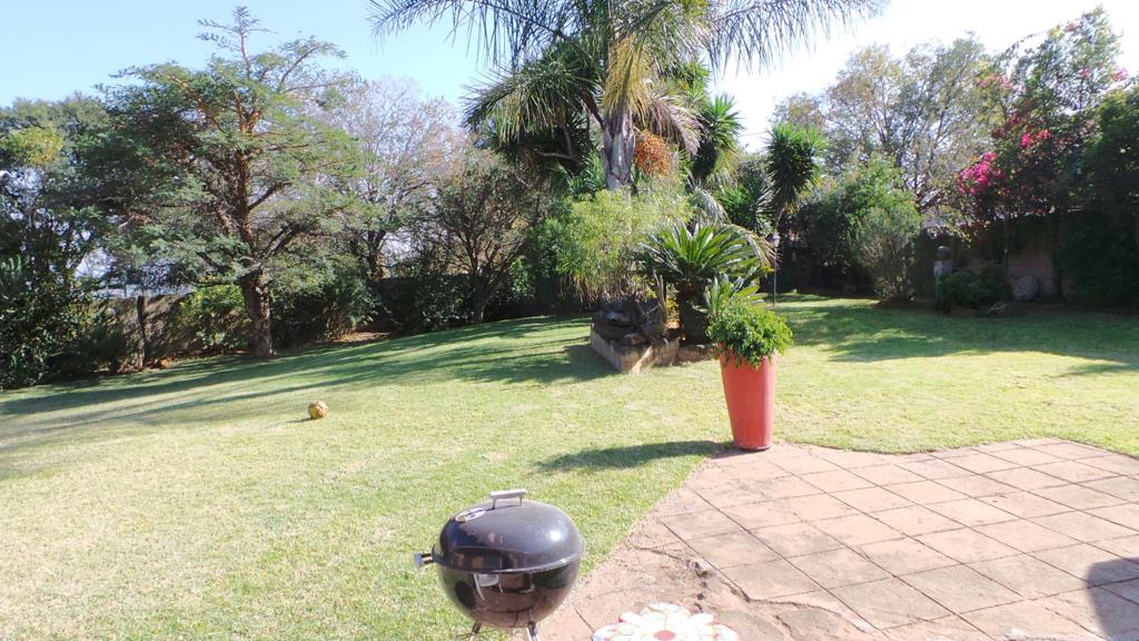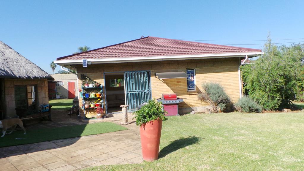 The expansive, well-maintained garden boasts mature trees and diverse landscaping, creating a private outdoor oasis. A unique thatched-roof outbuilding serves as an ideal lapa with braai facilities, perfect for entertaining. Additional structures include a versatile shed and block building.
