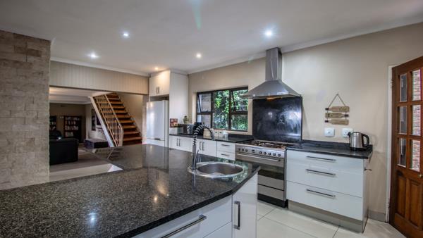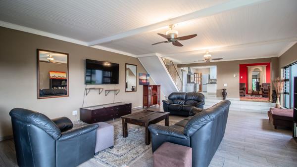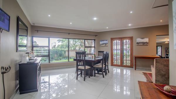 The living areas are designed for both relaxation and entertaining. The expansive dining room features a modern gas fireplace, creating a focal point for family meals, and steps down into a large lounge area fitted with laminate flooring that exudes style and durability. The lounge not only serves as a perfect cozy retreat but also opens up to a charming Lapa and a glistening swimming pool, all set against breathtaking north-facing views that create a serene outdoor oasis.