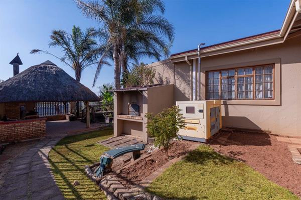 Entertainment extends outdoors with a heated swimming pool with cover, jacuzzi, and a thatched lapa featuring a built-in braai and pizza oven, ideal for family gatherings or entertaining friends. A tranquil fish pond adds a touch of serenity.