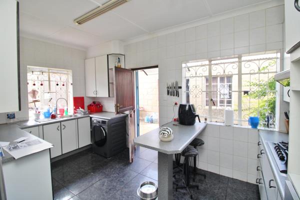 Separate kitchen with neat finishes and a stove, extractor fan, space for large appliances and a breakfast counter with direct access into the courtyard.