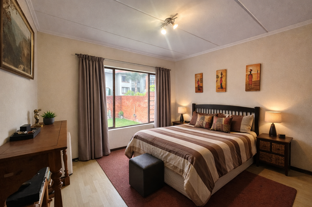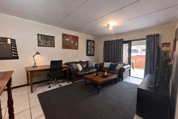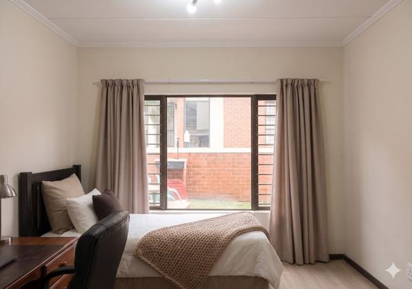 The layout is clean and practical. An open-plan living area flows directly onto a covered patio with a built-in braai, extending into a private garden that gives you that house feel without the upkeep. Its the kind of space that works just as well for pets as it does for relaxed weekends or everyday living.
