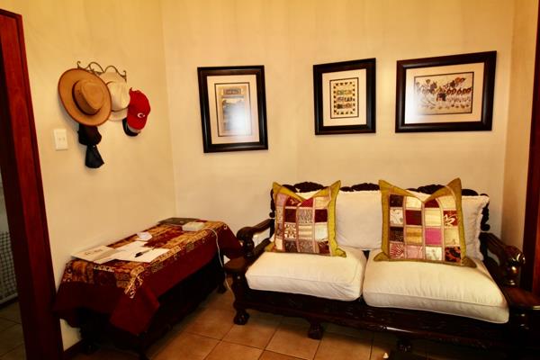 For entertainment, enjoy the built-in bar and a covered outdoor area with braai, ideal for hosting gatherings. Leisure continues with a covered pool, sauna, and beautifully established garden offering panoramic views from its hillside location.