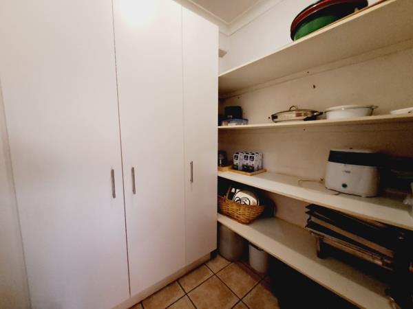 A modern kitchen with a breakfast bar, gas hob, eye-level oven and a separate pantry